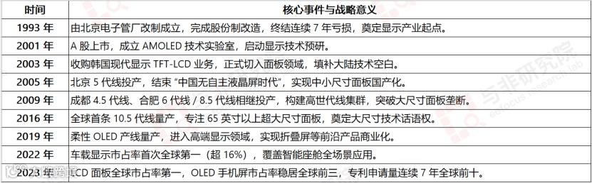 技术路径上,京东方走出“引进—消化—创新”的发展道路:2003年通过收购现代显示实现技术起步,2019年完成柔性OLED自主突破。产线建设方面,以5代线(2005)、8.5代线(2009)、10.5代线(2016)为关键节点,推动全尺寸面板国产化,打破日韩台长期垄断。 市场拓展上,从中小尺寸切入消费电子,逐步扩展至超大尺寸电视(2016)和车载显示(2022),形成“消费电子+专业显示”双轮驱动格局,2023年多品类出货量位居全球前列。