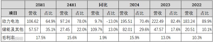 2025年上半年,动力电池业务营收106.62亿元,同比增长9.7%,占总营收比重降至64.9%;储能系统及其他产品营收达57.57亿元,同比增长109.7%,占比提升至35.1%,成为增长主力。
