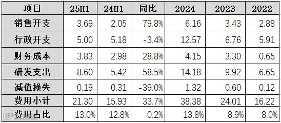 期间费用合计21.30亿元,同比增长33.7%,占总营收约13.0%。其中研发开支8.60亿元,同比增长58.5%;销售开支3.69亿元,同比增长79.8%;行政开支5.00亿元,同比下降3.4%;财务成本3.83亿元,同比增长28.8%;应收账款减值损失0.19亿元。应收票据及账款余额约94亿元,回款周期为102天,较去年同期略有下降。