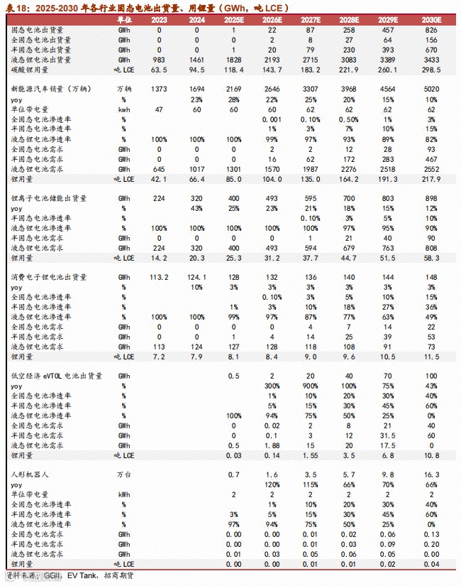 - 2025–2027年锂需求仍由新能源车与储能主导;2027–2030年半固态电池出货提升带动需求小幅上修;2030年后,随着全固态电池量产及eVTOL、人形机器人放量,锂需求将因单GWh用锂量大幅增加而迎来爆发式增长。