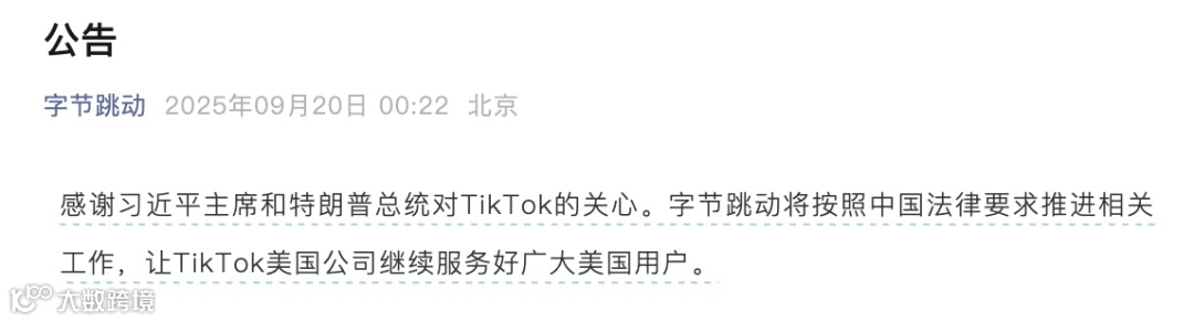 9月20日凌晨,字节跳动发布公告表示,公司将严格遵守中国法律法规,积极推进相关工作,确保TikTok美国业务持续稳定运营,继续为美国用户提供优质服务。