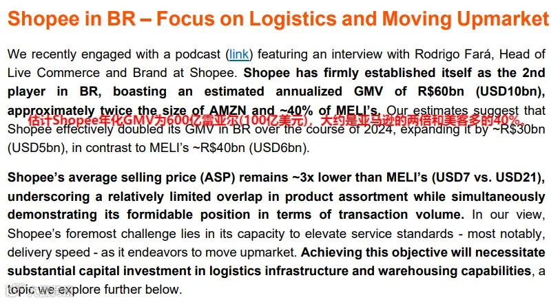 Shopee在巴西已深耕五年,综合实力位居第二。Itaú BBA报告显示,2024年Shopee巴西销售额约600亿雷亚尔(约合103亿美元),为亚马逊巴西的两倍,相当于美客多巴西业务的40%。公司最新财报确认,其已成为巴西订单量最大的电商平台。