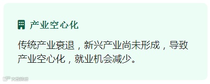 产业空心化:传统产业衰退、新兴产业尚未形成,造成就业萎缩、人口外流。