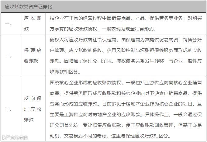 根据当前交易所市场上应收账款资产证券化项目类型,基础资产为应收账款类的资产证券化业务分类如下表所示: