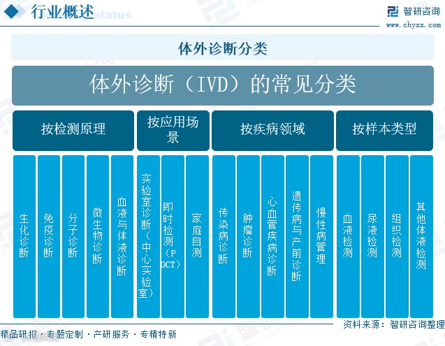 体外诊断(In Vitro Diagnosis, IVD)是指通过检测人体样本(如血液、体液、组织等),获取临床诊断、疾病监测或健康评估信息的技术手段。根据检测原理,IVD主要分为生化诊断、免疫诊断、分子诊断、微生物诊断、血液诊断及POCT(现场即时检测)六大领域,其中生化、免疫和分子诊断为当前主流方向。