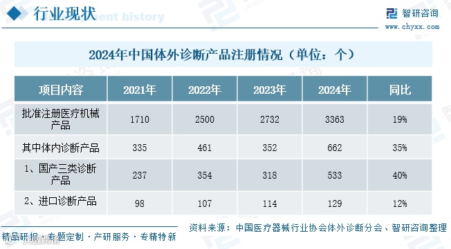 注册数据显示,2021-2024年医疗器械产品注册量从1710项增至3363项,年均复合增长率25.3%。同期,体外诊断产品注册量2024年达662项,同比增长35%,远高于器械整体19%增速。其中国产三类IVD注册量达533项,同比增长40%,占总量80.5%;进口产品129项,同比增长12%,占比由2021年29.3%下降至2024年19.5%,反映出国产替代进程加速。