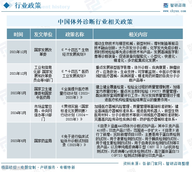 体外诊断是现代医疗体系的核心支撑,广泛应用于疾病预防、诊断与治疗决策。近年来,国家陆续出台《“十四五”生物经济发展规划》《“十四五”医药工业发展规划》《全面提升医疗质量行动计划(2023-2025年)》《免于进行临床试验体外诊断试剂目录(2025年)》等多项政策,为IVD产业转型升级提供制度保障,推动行业从规模扩张向高质量发展转变,持续满足国民日益增长的健康需求。