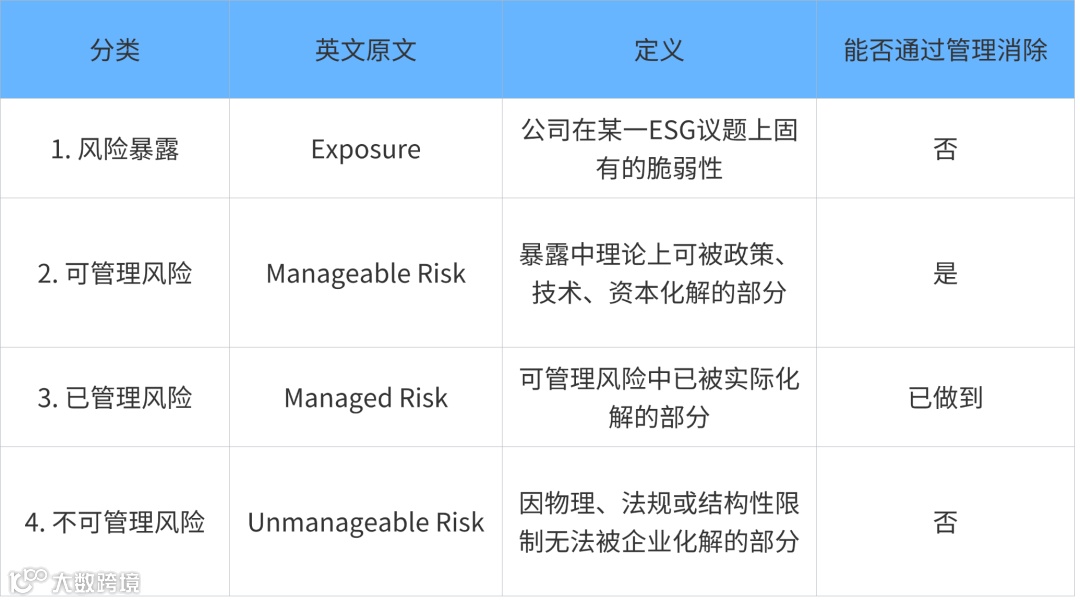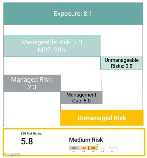 Sustainalytics的方法论中,风险如瀑布自上而下流动:Exposure → Manageable Risk → Managed Risk → Unmanaged Risk。