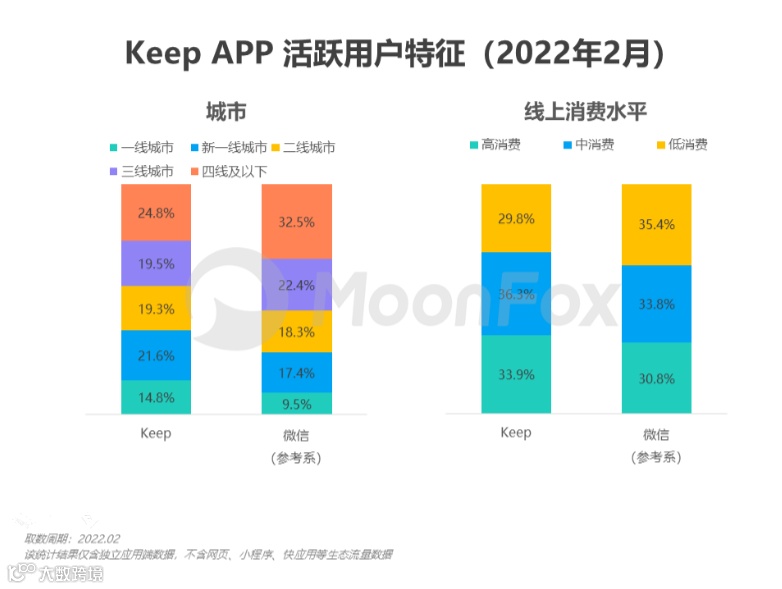 除此之外,结合此前月狐数据发布的Keep活跃用户特征来看,其活跃用户主要以一线和新一线城市25岁以下的女性为主,并具有一定的消费能力。但由于Keep在下沉市场渗透不足,并且考虑到以抖音直播电商、拼多多为代表的平台在下沉市场具有极高的心智占有率,这也意味着Keep在下沉市场用户的争夺中几乎没有什么优势。虽然目前Keep在第三方平台上也有旗舰店,但失去内容的加持,Keep又要如何刺激下沉市场下单呢?