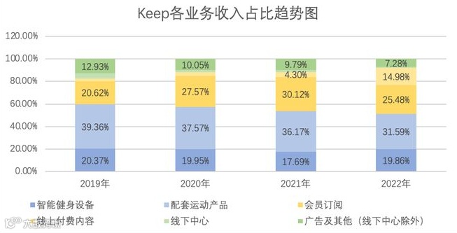 作为国外健身APP一哥的“Peloton”,其在收入结构也与Keep高度类似,包括自有品牌产品(即硬件销售)、会员订阅及线上付费内容、广告和其他服务。其中,占收入大部分的同样是硬件销售,在2019年至2021年的占比均在55%以上。