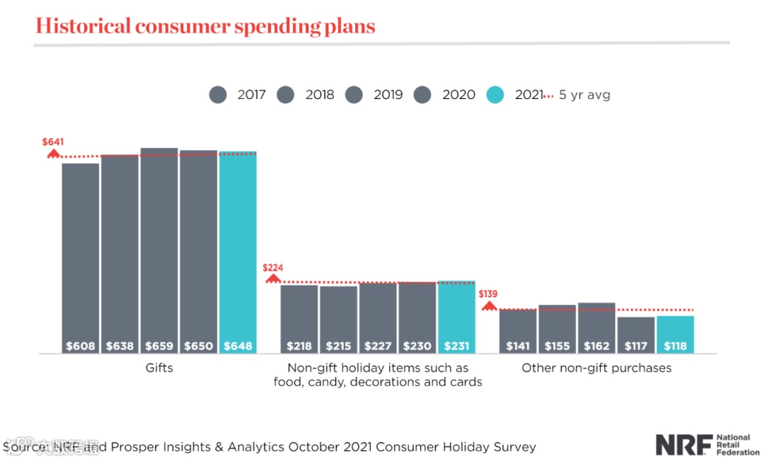 根据美国零售联合会和Prosper Insights & Analytics发布的年度调查,消费者计划今年为自己和家人购买礼品、节日用品和其他物品的计划开支为 997.73 美元。