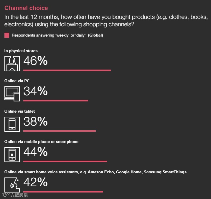 根据PWC在2021年6月发布的全球消费者洞察报告显示,过去一年中,44%的受访者每周或每天使用手机购物。