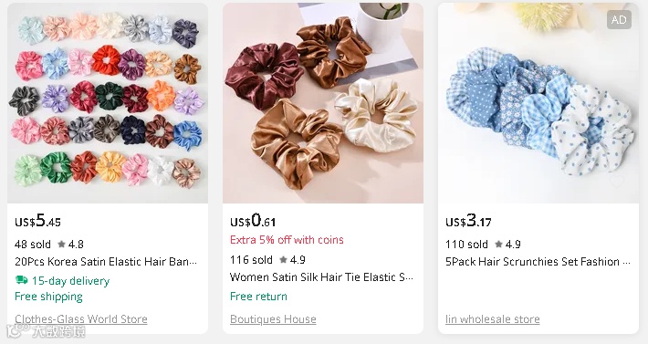 而在国内淘宝,单个大肠发圈的价格只要3-5块钱之间,5 个起装的组合套装售价也才 10 元左右。至于拼多多那就更不用说了,6 个的组合套装只要 6-8 元的价格就可以轻松拿下。