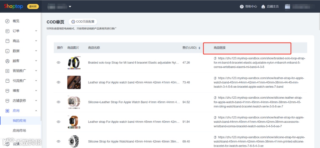 功能设置方法:进入Shoptop后台→应用市场→COD单页,点击【启用】即可看到对应页面的商品链接,点击链接预览商品。