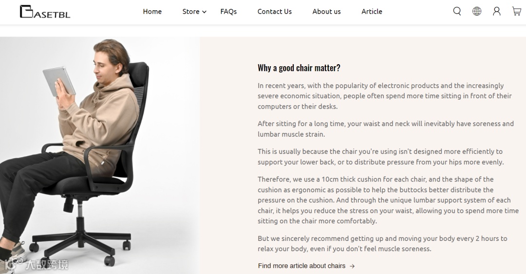 网站首图Banner简单明了展示BASETBL产品,让消费者能一眼明白品牌的核心产品就是办公椅等家具。