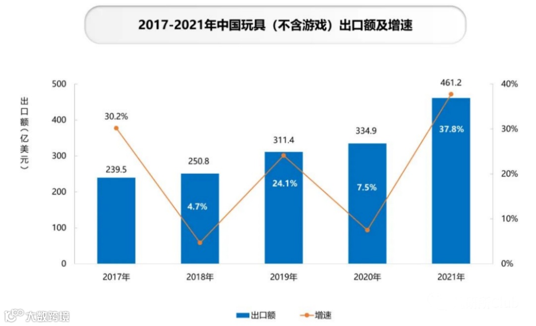 中国作为玩具生产和出口大国,被称为“世界玩具工厂”。据《2022中国玩具和婴童用品行业发展白皮书》数据,2021年,中国玩具(不含游戏)出口额为461.2亿美元,比上年增长37.8%,增速为近五年最高。
