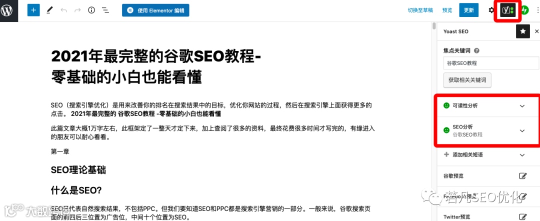 进入你的wordpress后台,编辑文章,它提供了两个固定的指标,一个是seo得分,一个是可读性得分。你可以简单的理解为,你把这两个指标完成为绿色,那么你的文章就有更大的可能被谷歌收录。