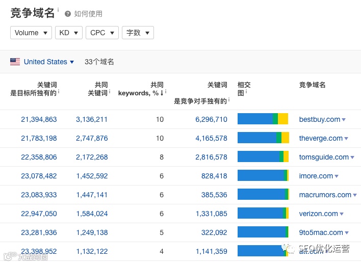 Site Explorer 还配备了查看竞争域的选项。竞争域名报告列出了在你的企业网站列出的相同关键字下排名的网站。此外,你可以查看网站与你的网站相比的常见关键字和独特关键字的数量。通过这种方式,你可以了解你的主要竞争对手是谁,通过关键字了解他们的强项在哪里,并采取措施模仿他们的工作以有机地获得流量。