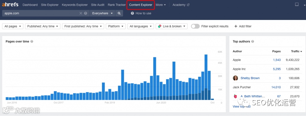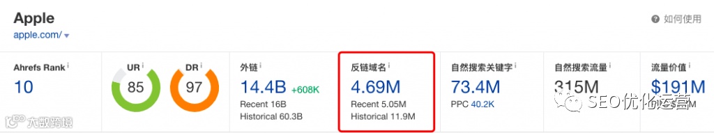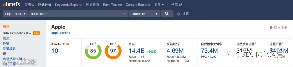 在 SEO 方面,关键字很重要。Ahrefs 为你提供了惊人的关键字研究和衡量工具,以便你可以让你的网站保持对正确关键字和关键短语的排名,从而帮助你取得成功。 如上图的73.4M,此数据就是apple.com的自然排名。