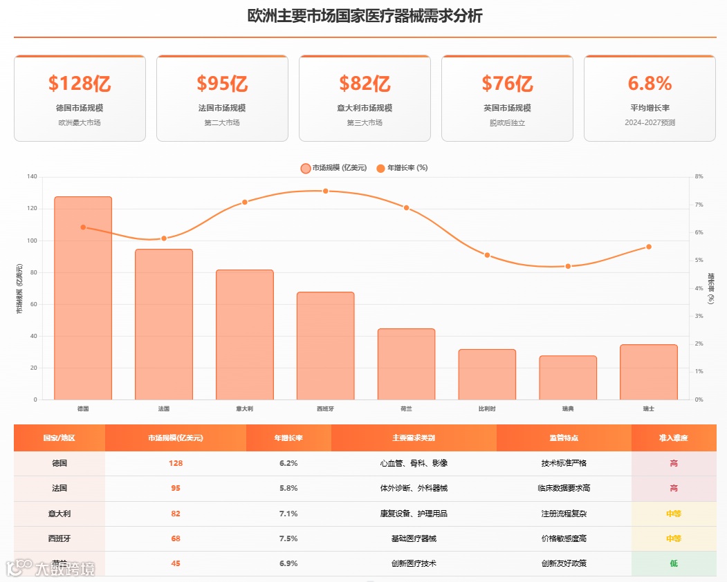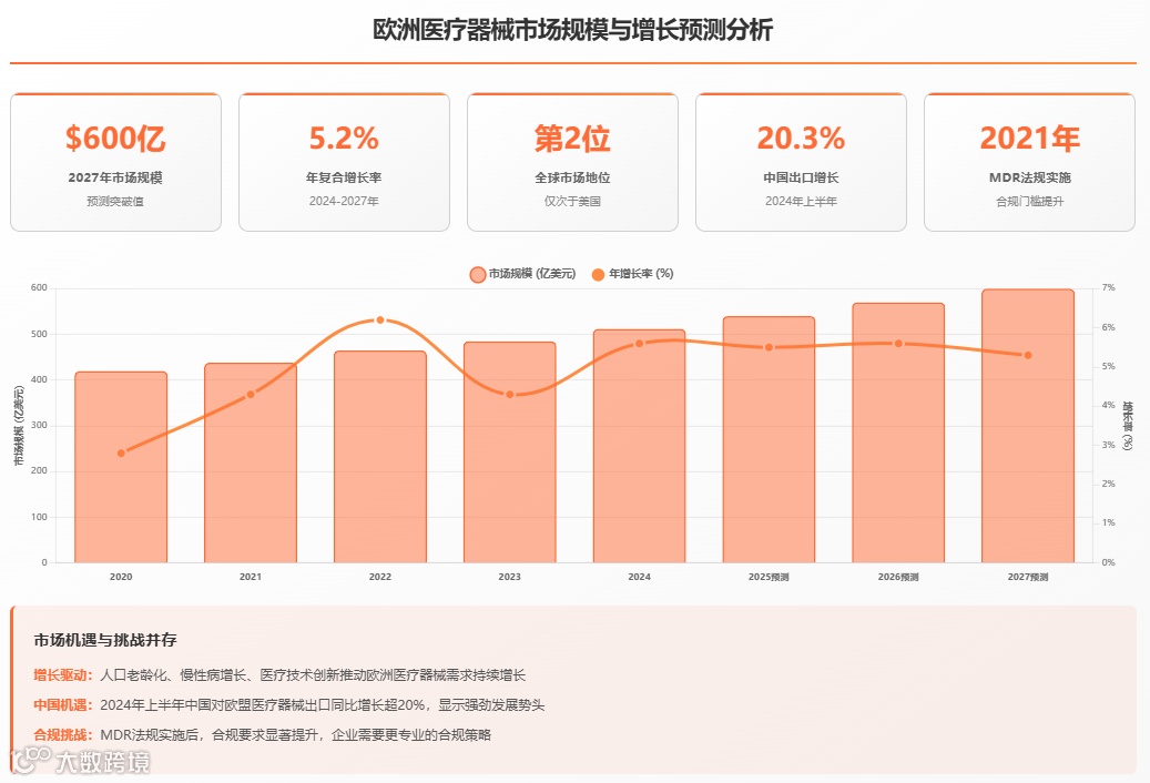 随着全球医疗健康需求的快速增长,欧洲作为全球医疗器械市场的第二大阵地,市场规模预计到2027年将突破近600亿美元,年复合增长率超过5%。与此同时,欧盟对医疗器械产品的监管日趋严格,2021年正式实施的医疗器械法规(MDR)更是将合规门槛提高到了一个全新高度。