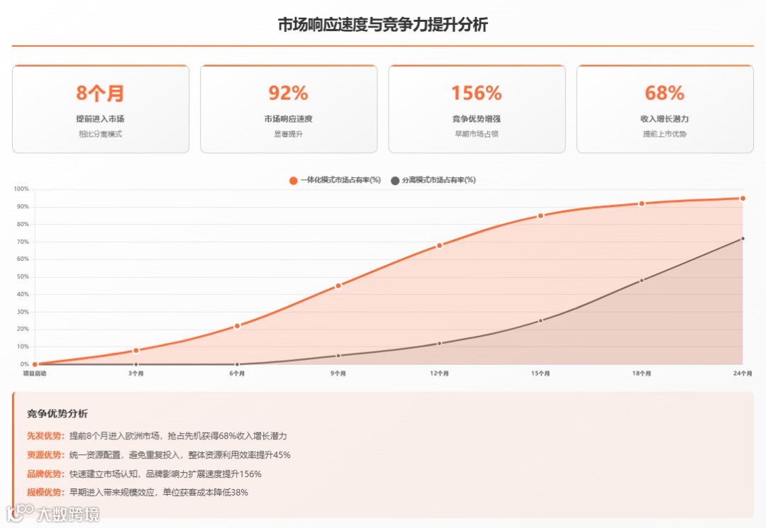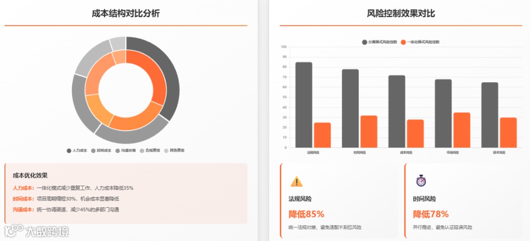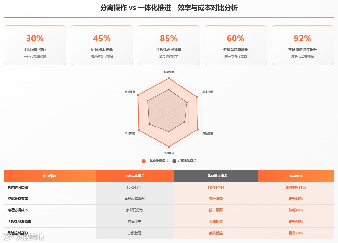 一体化推进带来的优势也非常明显:资料准备更加统一和系统,避免了重复收集和审核;沟通渠道更加畅通,减少了多部门、多机构之间的协调成本;整体时间周期平均缩短30%以上,极大提升企业的市场响应速度和竞争力。