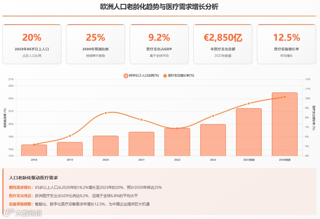 近年来,越来越多中国医疗器械企业将目光投向欧洲市场。这背后有着多重因素推动。首先,欧洲人口老龄化问题日益严峻,65岁以上人口比例持续攀升,医疗需求不断扩大。据欧盟统计局数据,2023年欧洲65岁及以上人口已占总人口的近20%,预计到2030年这一比例还将进一步提高。人口结构的变化,直接推动了医疗服务和医疗器械的刚性需求增长。