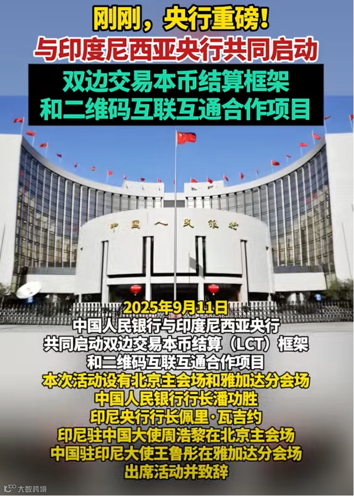 2025年9月11日,中国人民银行与印度尼西亚央行共同启动双边交易本币结算(LCT)框架和二维码互联互通合作项目。