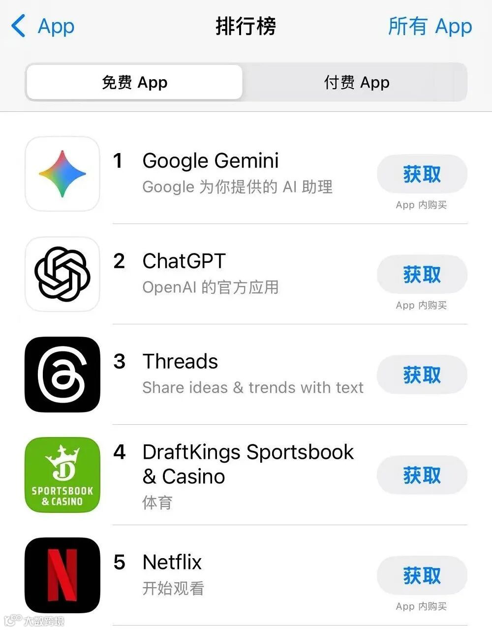 智东西9月15日报道,谷歌DeepMind的AI应用Gemini凭借图像编辑模型“Nano Banana”的病毒式传播,近日登顶美区苹果App Store免费应用榜,超越ChatGPT,成为当地最受欢迎的应用之一。