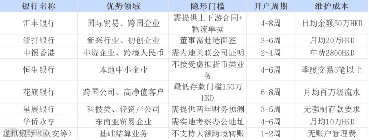 选择建议:大型企业优先选汇丰、渣打;中小型企业或初创公司可尝试中银香港或虚拟银行;特定行业需求则考虑外资银行。