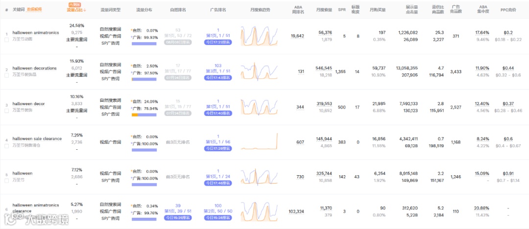 关键词反查显示,主要流量词包括“halloween animatronics”(PPC竞价0.2美元)、“halloween decorations”(PPC竞价0.44美元)和“halloween decor”(PPC竞价0.37美元),多数流量依赖广告投放,自然流量占比较低。