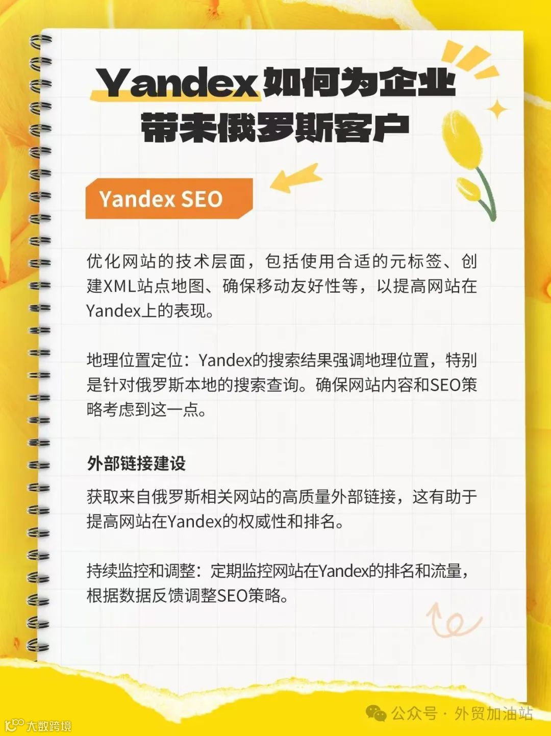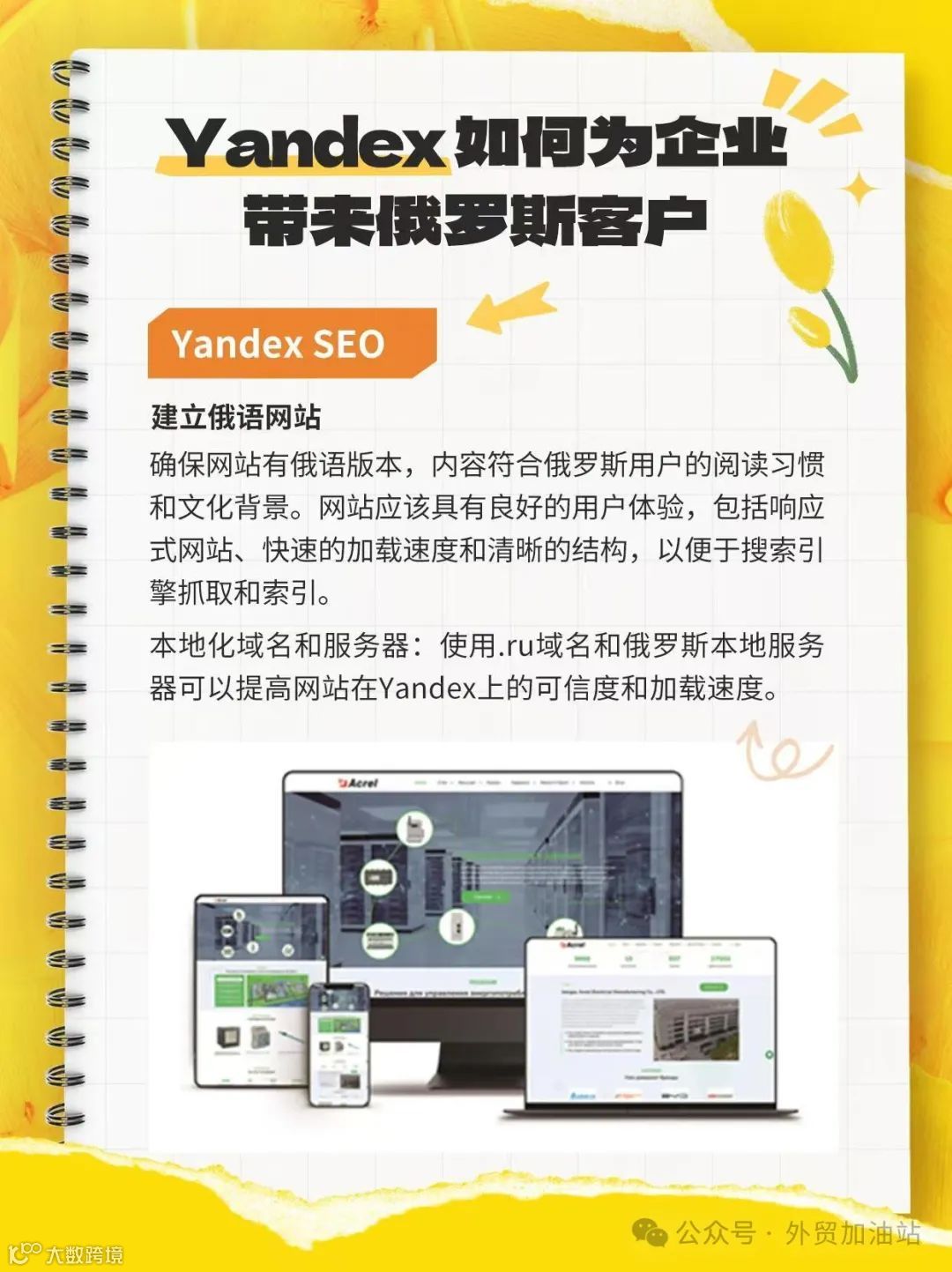 --确保您的网站有俄语版本,内容符合俄罗斯用户的阅读习惯和文化背景。优化你的网站以在Yandex搜索结果中获得更高的排名,这样可以使你的产品在俄罗斯和其他CIS国家更容易被发现。