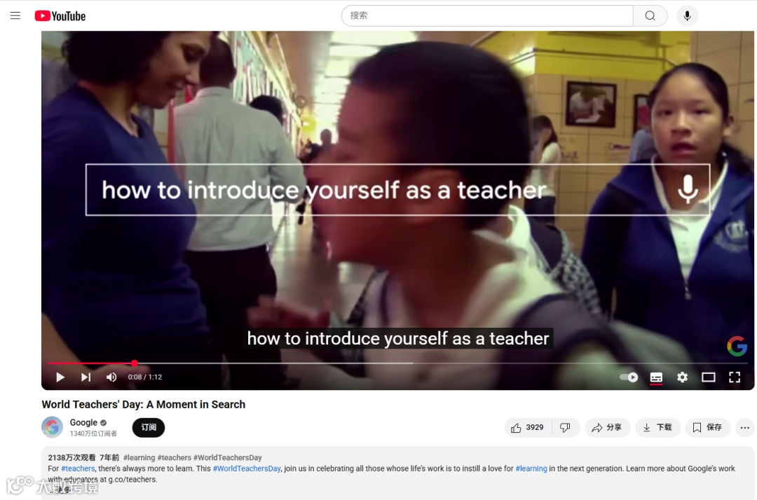 品牌案例:谷歌发布短片《A Moment in Search》,致敬教育工作者。该视频上线一个月内播放量超1500万次,巧妙展示了搜索工具在教学中的应用,强化了品牌与教育领域的关联。