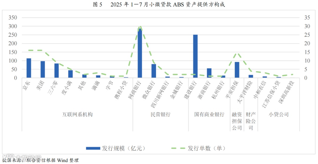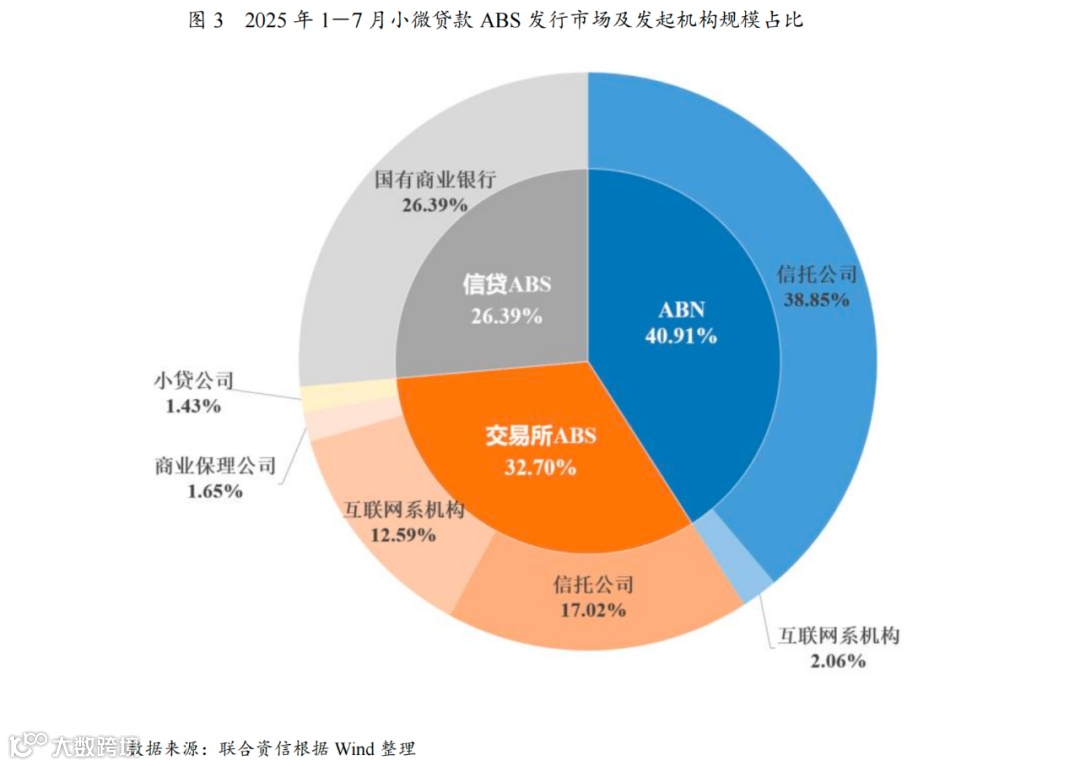 2025年1-7月,ABN市场发行规模占全市场小微贷款ABS总量的40.91%,是当前最活跃的发行渠道。随着政策支持深化,预计民营银行将继续推动ABN市场扩容。交易所ABS占比32.70%,仍是重要平台,依托互联网机构的数据与流量优势,将持续赋能小微融资。尽管信贷ABS发行规模同比下降明显,但国有银行主导的大额单笔发行模式具备稳定性,未来仍有较大增长空间。