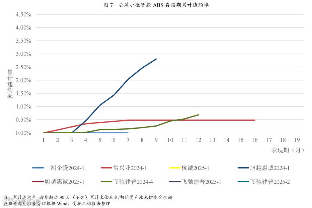 基于联合资信对截至2025年7月披露数据的8单公募ABS及当年跟踪评级的31单私募ABS样本分析,小微贷款ABS累计违约率整体平稳,未出现趋势性波动。公募产品中最高累计违约率为2.81%,但因存在超额利差和证券持续兑付机制,优先级证券信用支持增强,风险可控。部分项目无违约主要因存续期不足3个月或封包期违约资产已赎回。