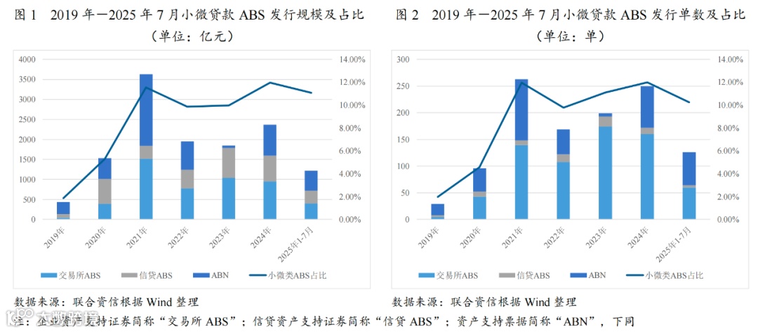 2025年1-7月,小微贷款ABS共发行126单,同比上升10.53%;发行规模达1214.79亿元,同比下降9.67%;占全市场ABS发行规模的11.08%,同比下降2.92个百分点。