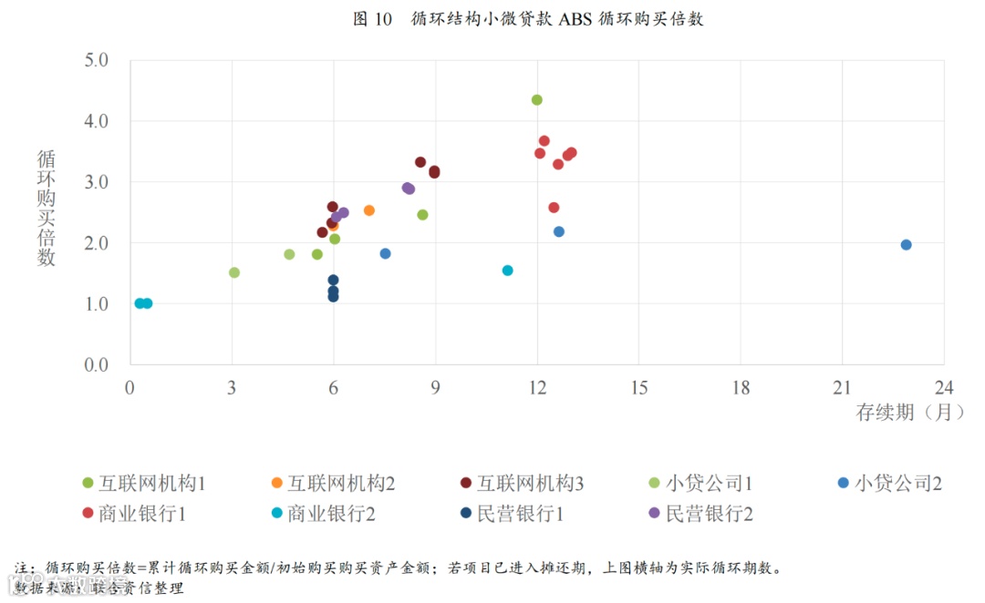 针对设有循环购买结构的小微贷款ABS/ABN,联合资信选取3单公募信贷ABS、25单交易所ABS和5单ABN作为样本分析。样本平均循环购买率为86.91%,其中互联网机构提供资产的产品均值达99.17%,国有商业银行产品为57.98%。循环购买倍数最高达4.34倍(已进入摊还期),最低为1.01倍(仍在循环期且循环时间不足一个月)。由于产品设计差异,相同存续期内倍数波动较大。整体而言,循环购买机制有效缓解短期资产与长期证券之间的期限错配问题,提升资金使用效率。