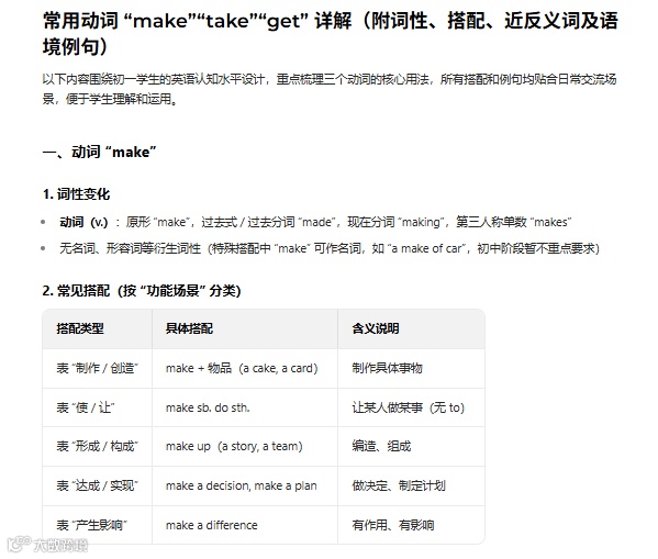 词汇信息拓展:向豆包输入“请详细列出 [具体单词列表] 的词性变化、常见搭配、近义词、反义词以及在不同语境下的例句”,例如:“请详细列出‘make’‘take’‘get’这几个常用动词的词性变化、常见搭配、近义词、反义词以及在不同语境下的例句”。