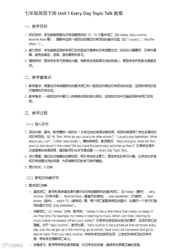 打开豆包网页版或APP,输入指令:“我是一名 [具体年级] 的英语教师,正在准备 [教材版本] 第 [X] 单元 [具体课程内容] 的课程。请为我生成一份包含导入、新知识讲解、课堂练习、课堂总结和作业布置等环节的教案,每个环节需说明设计意图和预计时长。在新知识讲解部分,要结合生动的例句和形象的比喻,帮助学生理解重点词汇和语法;课堂练习需设计多样化题型,如填空、选择、造句等。”
