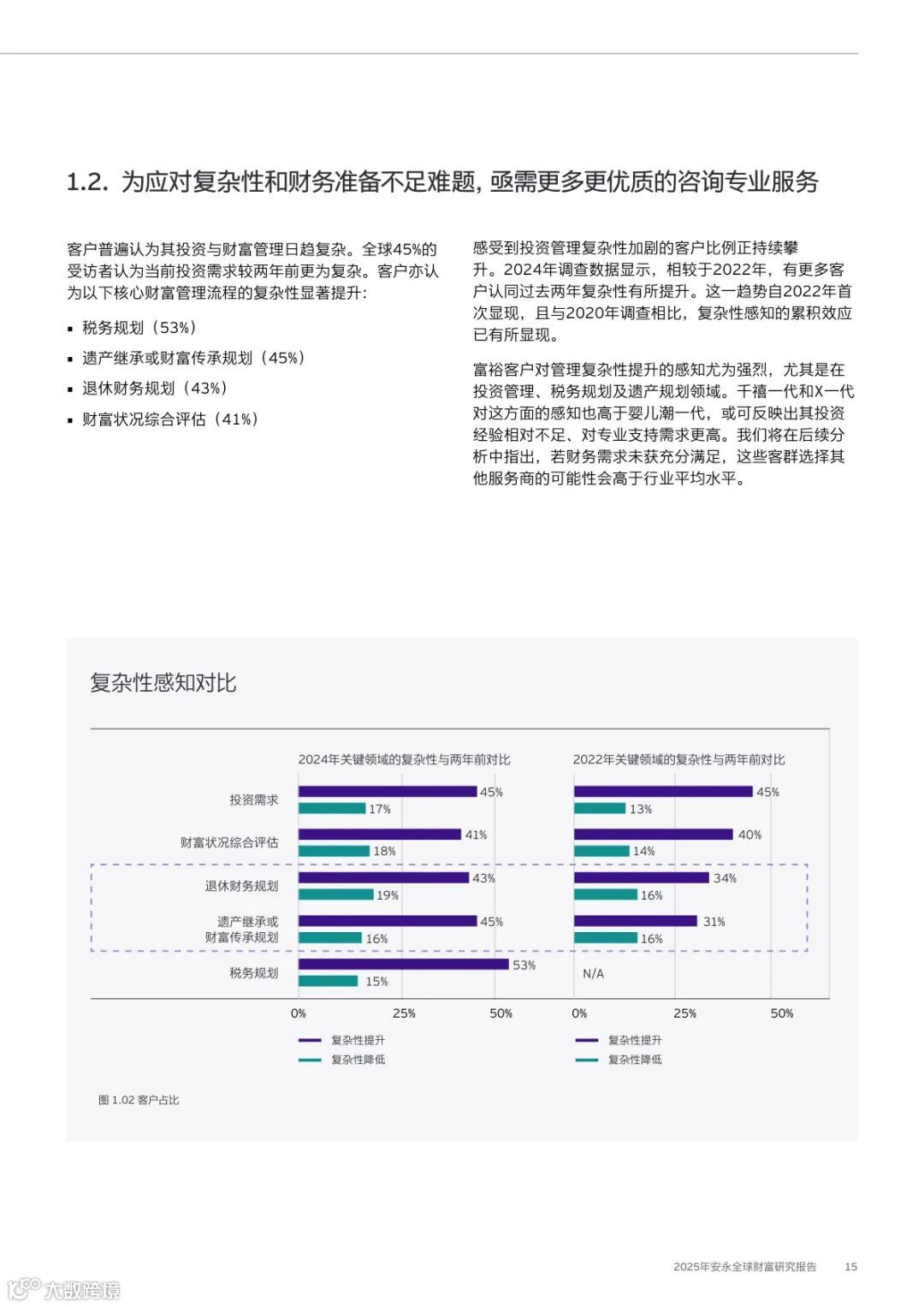 52%客户主动讨论市场影响,44%增加会面频次,44%加强自主管理。45%客户认为投资复杂性显著上升,尤其在税务、遗产与退休规划领域,对服务机构专业能力提出更高要求。