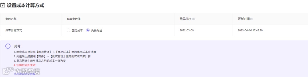 有两种模式可以选择:固定成本和先进先出。