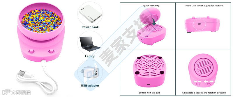 将电动串珠机与电源连接起来,由塑料、金属和电子元件组成的设备就可以运行了。使用者可以使用速度控制和顺时针或逆时针方向来高效制作串珠首饰。