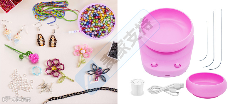 电动串珠机可调节速度有3种,包含2个碗,适用于制作手链、项链和腰珠,配备有3个弯针。