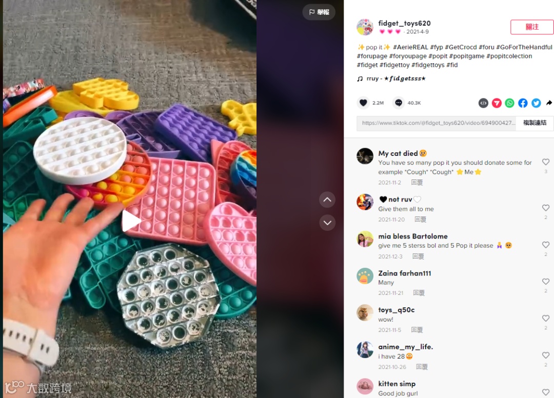 截至到2021年12月,TikTok带有标签 “Fidgettoys(指尖玩具)”的视频观看次数超过60亿次,“PopIt(硅胶玩具)”标签积累的点击量突破10亿,最受欢迎的帐户粉丝数高达200万。