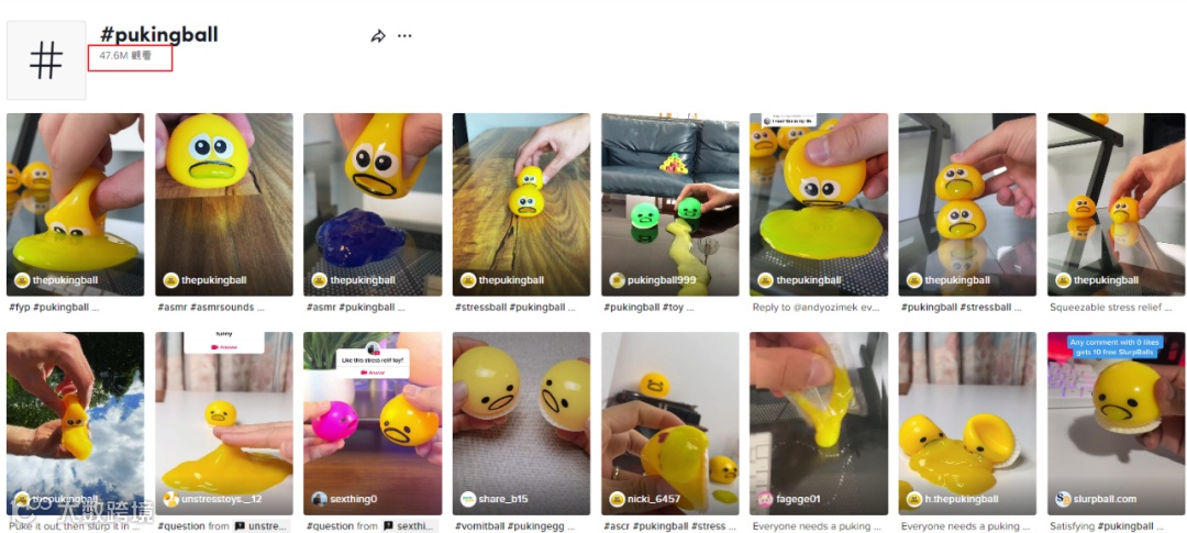 作为近几个月热门的解压玩具之一,呕吐球在TikTok上的相关话题标签#pukingball总播放量已达到47.6M(4760万左右)。