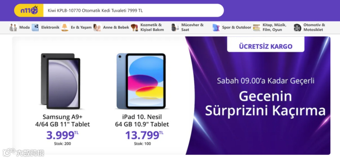 N11(www.n11.com)成立于2012年,韩国SK集团投资背景,汇集百万商品、超30万注册卖家、月访问PV7700万+、多种支付方式(PayPal和支付宝等),土耳其最大的综合性电商平台之一。