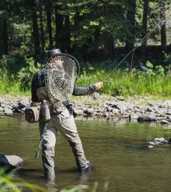与传统坐在水边安心钓鱼不同,飞钓需要抛投、涉水,具有不小的运动量。其对装备也提出了更高的要求,如钓竿要轻、细、弹性好,才便于抛出,服装需要质量高,防水且舒适,同时,还需要能够放置毛钩、抄网等设备。