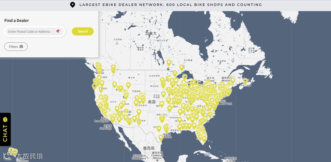 当用户在谷歌搜索“我附近的电动自行车商店(Electric Bikes Shop Near Me)”时,在非常靠前的搜索结果里会显示Aventon网站的页面,点进去之后是Aventon在全美所有的经销商地图,方便用户定位并找到附近的Aventon线下店。