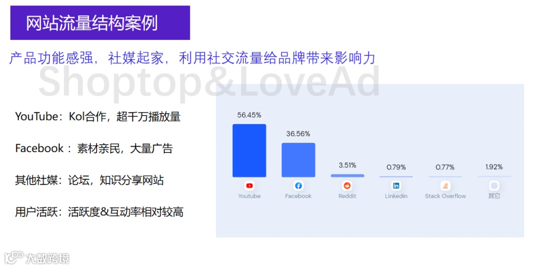 产品功能感强,搜索以及自然流量占大部分,利用社交流量给品牌带来影响力