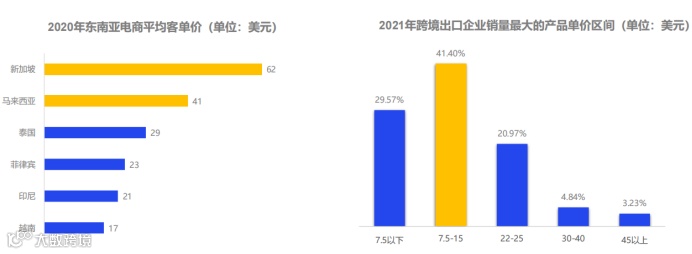 根据Statista数据显示,东南亚电商平均客单价在17-62美元之间,销售量最大的产品价格在25美元以下。与各国经济基础与实际消费水平相吻合,新加坡位居榜首达62美元,其次是马来西亚41美元,印尼和越南客单价相对较低。