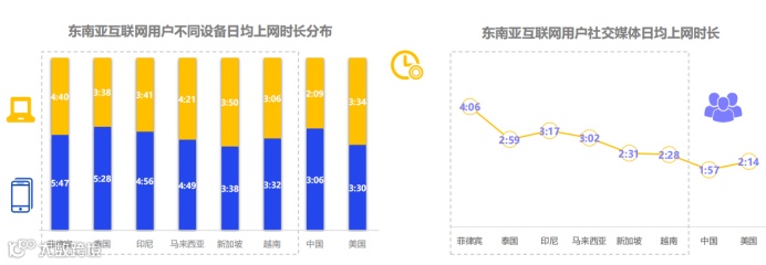 随着互联网技术迅速发展,4G普及移动端的覆盖和智能手机价格降低,就全球来看,东南亚拥有较活跃的互联网用户,上网时长远超美国与中国。其中菲律宾移动端用户上网时长可达5小时47分钟,泰国、印尼、马来西亚、新加披移动端使用时长最短可达3小时32分钟。东南亚互联网用户社交媒体日均上网时长在3小时左右,社交媒体的使用已经成为东南亚日常生活不可或缺的一部分。